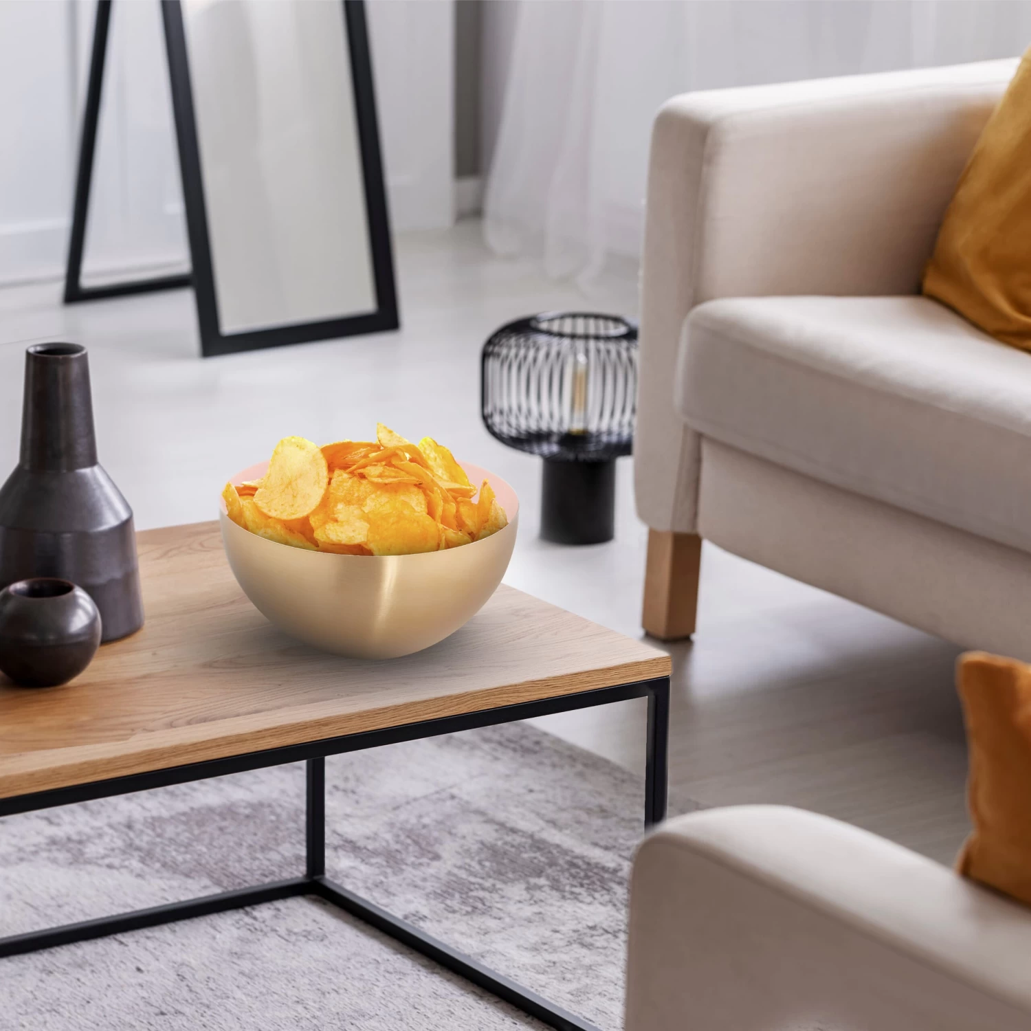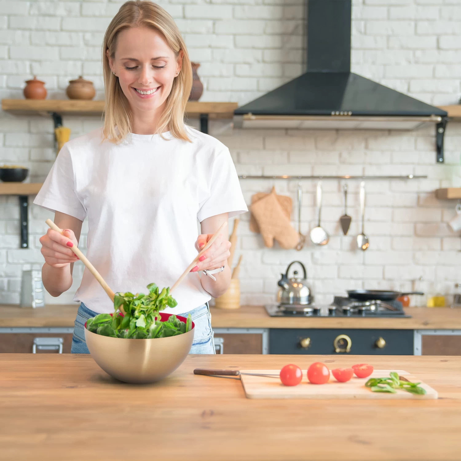 Mit dieser edlen Metallschüssel servierst Du Salate, Chips und andere Snacks besonders dekorativ. Das elegante, zweifarbige Design der Salatschüssel ist dabei ein Blickfang auf jeder gedeckten Tafel. Aber nicht nur als Servierschale, sondern auch als Rührschüssel zum Zubereiten von Teig beim Backen ist die Kochschüssel wunderbar geeignet. Die Schüssel besteht aus langlebigem Edelstahl und kann nach dem Gebrauch unter fließendem Wasser schnell und einfach gereinigt werden.