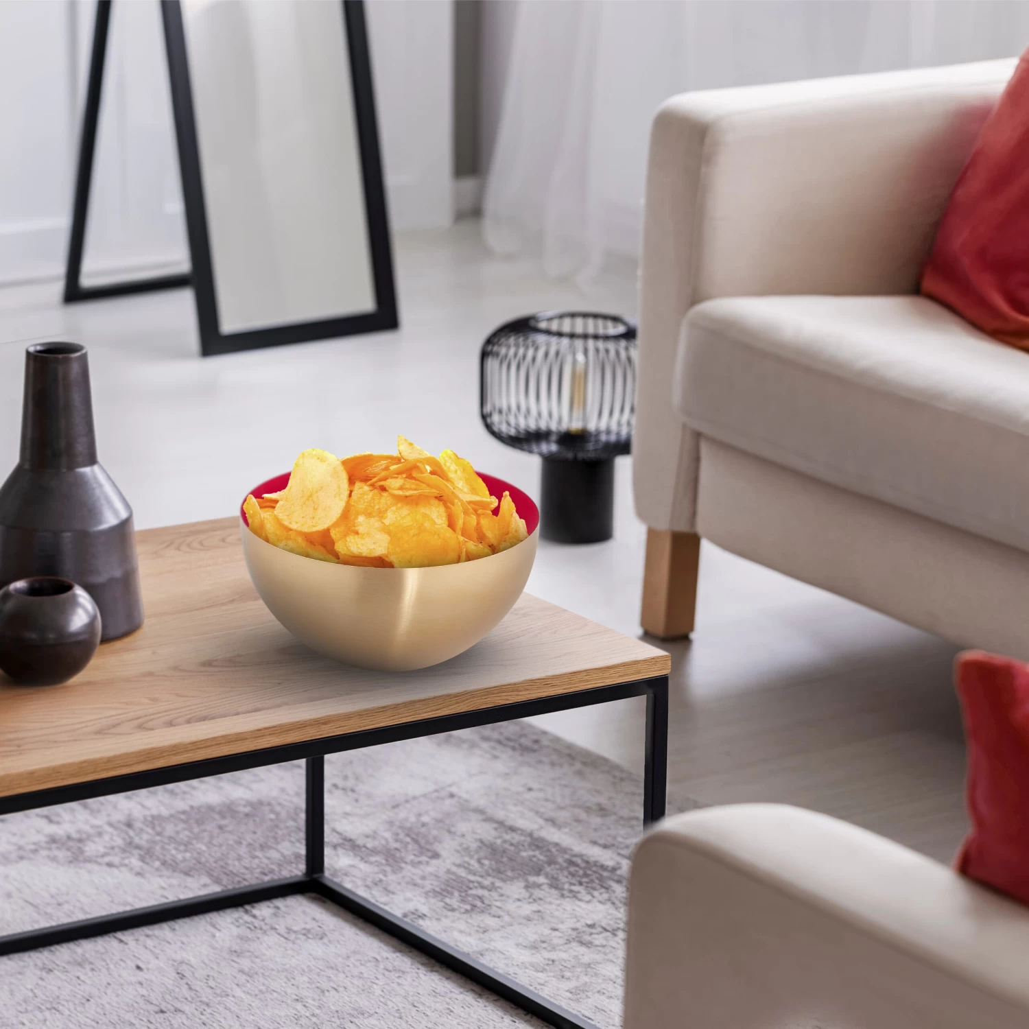 Mit dieser edlen Metallschüssel servierst Du Salate, Chips und andere Snacks besonders dekorativ. Das elegante, zweifarbige Design der Salatschüssel ist dabei ein Blickfang auf jeder gedeckten Tafel. Aber nicht nur als Servierschale, sondern auch als Rührschüssel zum Zubereiten von Teig beim Backen ist die Kochschüssel wunderbar geeignet. Die Schüssel besteht aus langlebigem Edelstahl und kann nach dem Gebrauch unter fließendem Wasser schnell und einfach gereinigt werden.