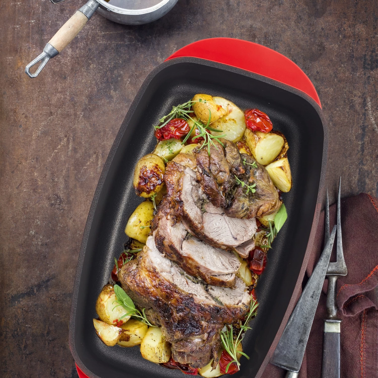 Ob Geflügel, Gänse- oder Schweinebraten: Wenn Sie Ihre Lieben mit einem zünftigen Mahl verwöhnen möchten, muss der Bräter mit von der Partie sein. Der Glasdeckel des Schmortopfs lässt sich auch als Auflaufform für Lasagne, Spargel und vieles mehr nutzen. Dank der smarten Antihaftbeschichtung benötigt der ofengeeignete Aluguss Bräter nur sehr wenig Öl bzw. Bratfett. Außerdem geht die Reinigung leicht von der Hand, die auch mittels Spülmaschine erfolgen kann.