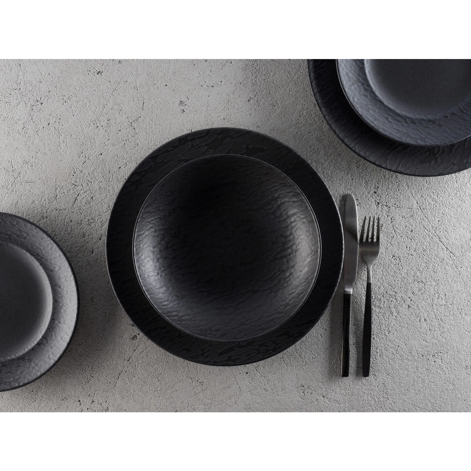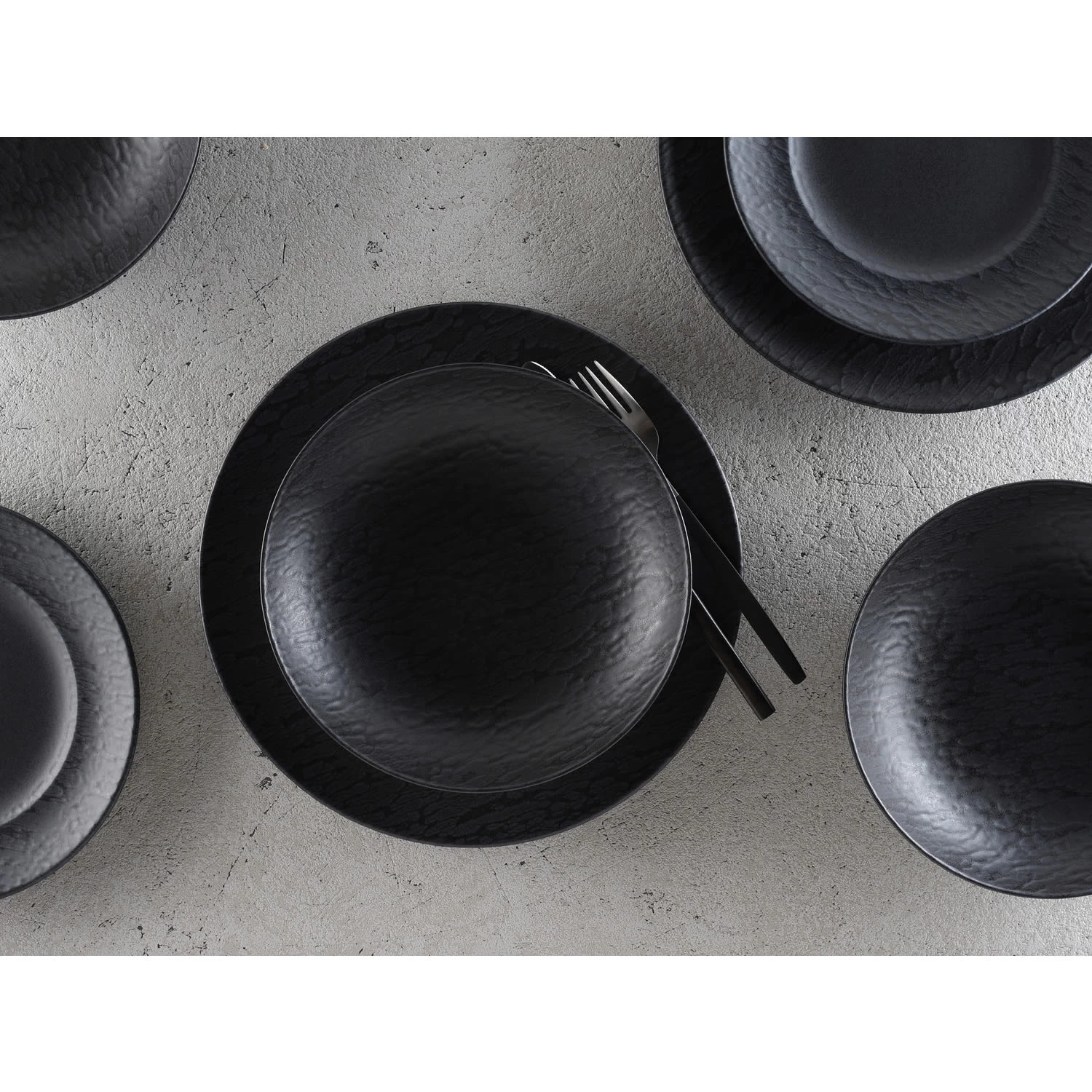 Das Geschirr präsentiert sich „schwergewichtig“ mit einer neuen Glasurtechnik in seidenmatter Stein Optik. Durch die unregelmäßige, organische Form ist jedes Teil ein Unikat.
