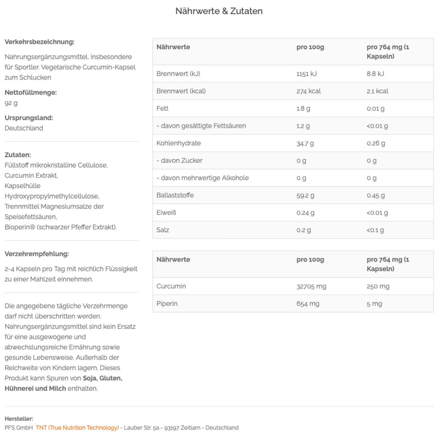 TNT Curcumin wurde nach der Produktion von einem externen Prüflabor getestet, um die Nährwerte zu überprüfen. TNT Curcumin wurde zusätzlich mikrobiologisch auf Verderbnis- und Krankheitserreger getestet.