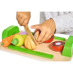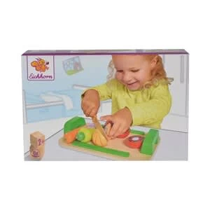 Mit dem Eichhorn Schneidebrett können die Kleinen die ersten Versuche unternehmen Obst oder Gemüse zu schneiden. Schneidebrett von Eichhorn 12-teilig ab 2 Jahren Set mit Gemüse oder Obst inklusive Holztablett aus Linden- und Sperrholz Jede Frucht und jedes Gemüse besteht aus zwei Teilen, die mit einem Klettverschluss verbunden sind. Mit dem Messer wird die Verbindung gelöst und es entstehen zwei Teile.