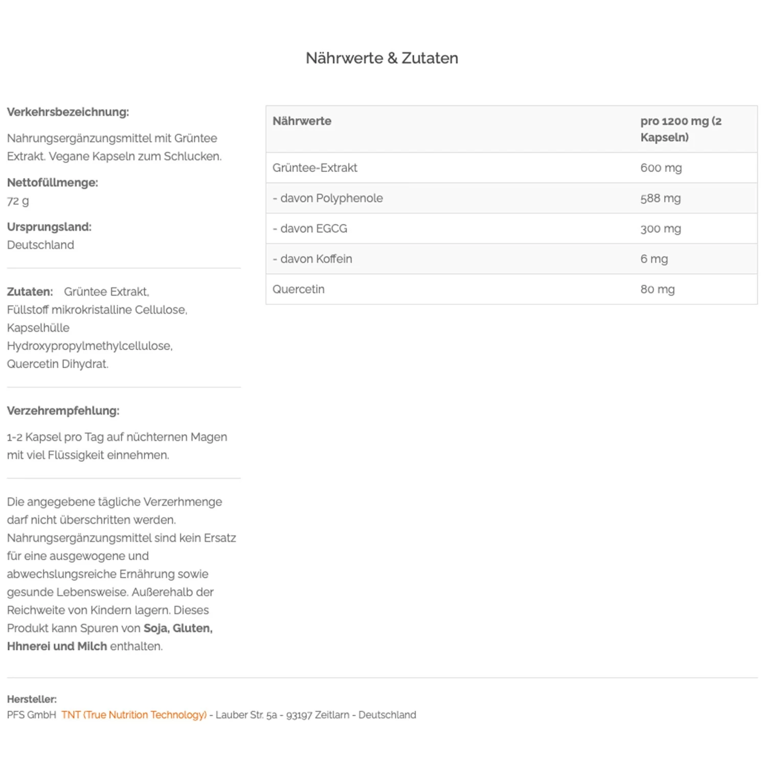 – Pro Kapsel: 300mg Grünteeextrakt. Davon 294mg Polyphenole, 150mg EGCG und 3mg Koffein.