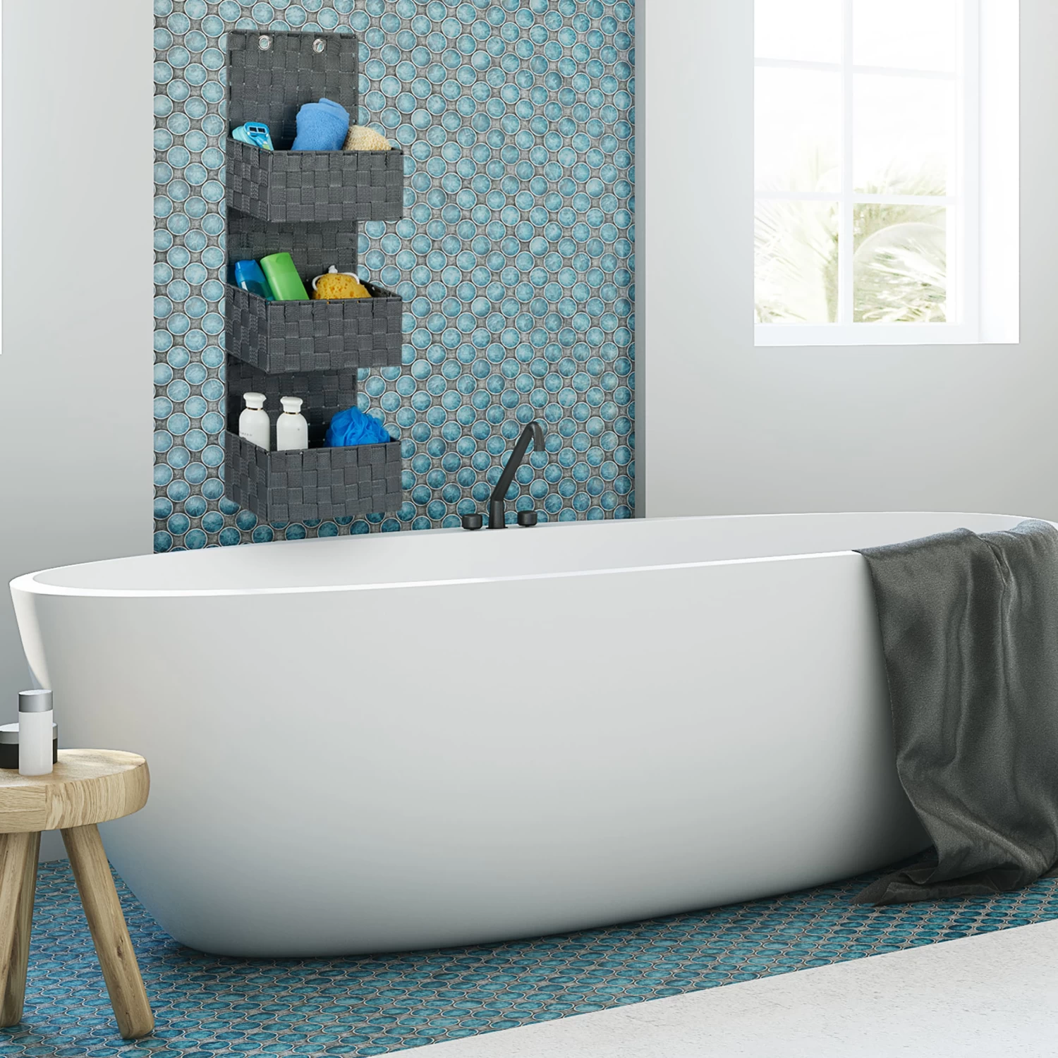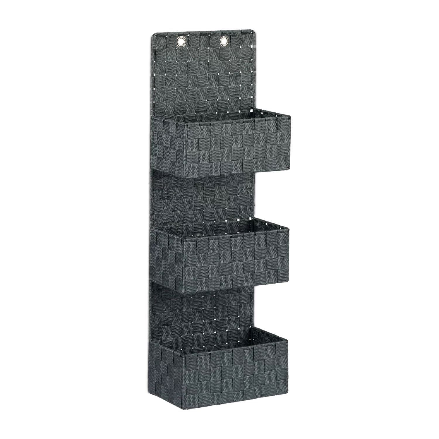 Es müssen nicht immer schwerfällige Möbel sein, die unter heroischem Kraftaufwand von A nach B gehievt werden müssen und viel Platz in Anspruch nehmen. Mit diesem Hängeorganizer schaffen Sie im Handumdrehen neuen Stauraum für Ihre Sachen. Um loszulegen, benötigt der Organizer lediglich 2 Haken im Abstand von rund 9 cm. Die 3 Aufbewahrungskörbe sind durch das gelungene Zusammenspiel der elastischen Wände mit dem stabilen Eisengestell gekennzeichnet. Der Wandorganizer ist nicht nur extrem praktisch, sondern dank seiner dezenten Bänder-Optik eine Zierde in jedem Zimmer.