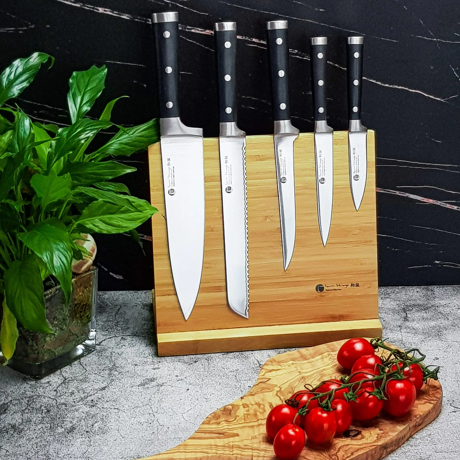 Zum Kochmesser-Set gibt es einen stylischen Magnet-Bambusständer, der alle 5 Messer mit den drei integrierten Magneten sicher festhält.