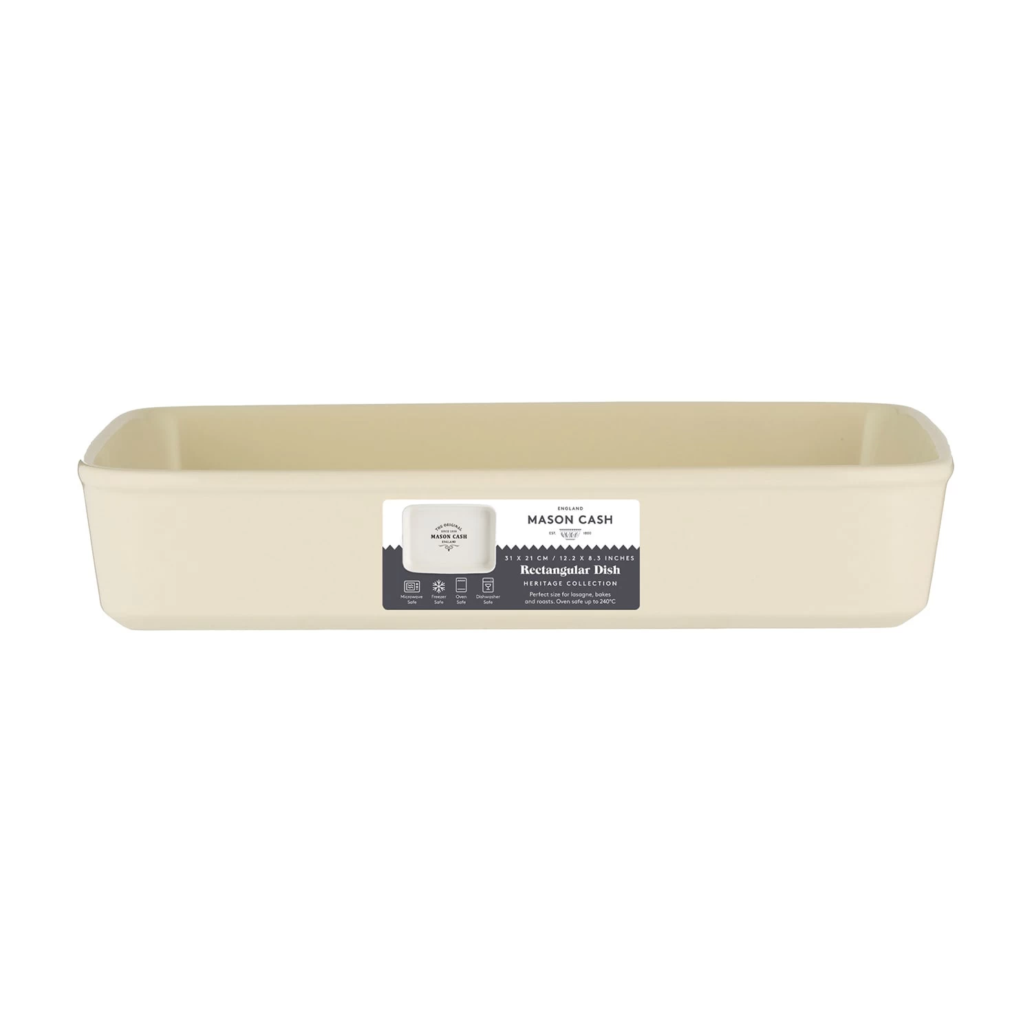 Das Design der Heritage-Produkte ist inspiriert vom Küchendesign des frühen 20. Jahrhunderts – traditionell und modern zugleich – und somit ein echter Hingucker mit zeitloser Qualität und Ausstrahlung. Die Form besteht aus Steingut und ist für Ofen, Mikrowelle, Spülmaschine und Gefrierschrank geeignet. Sie ist Teil der Mason Cash Heritage Kollektion von Ofenformen und Zubehör. Mit einer Größe von 31 cm x 21 cm x 6 cm und einem Fassungsvermögen von 2,5 Litern ist die Ofenform ideal für Familiengerichte wie Lasagne, Gratins, Aufläufe oder Braten. Es ist die perfekte Form um Gericht zuzubereiten und direkt am Tisch zu Servieren.