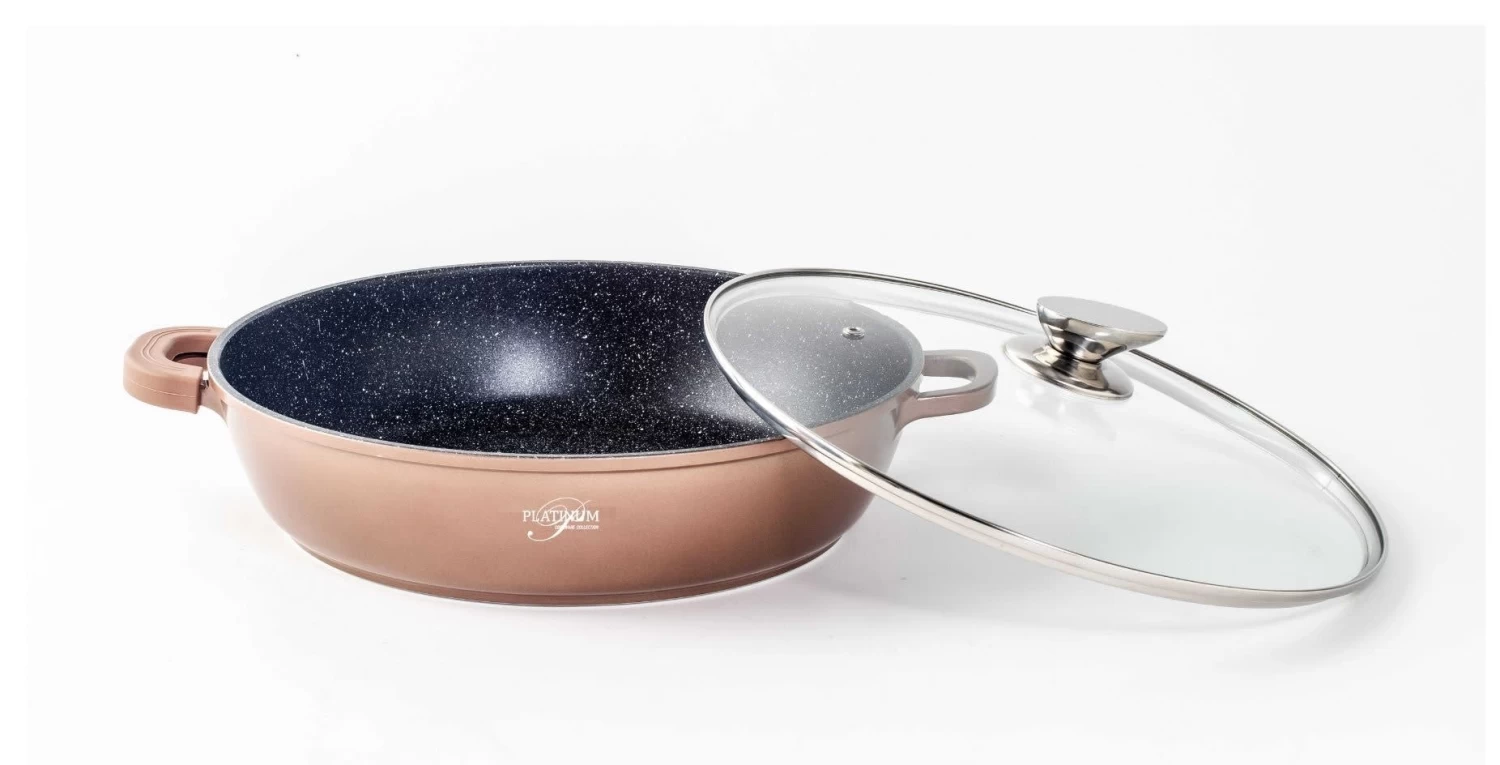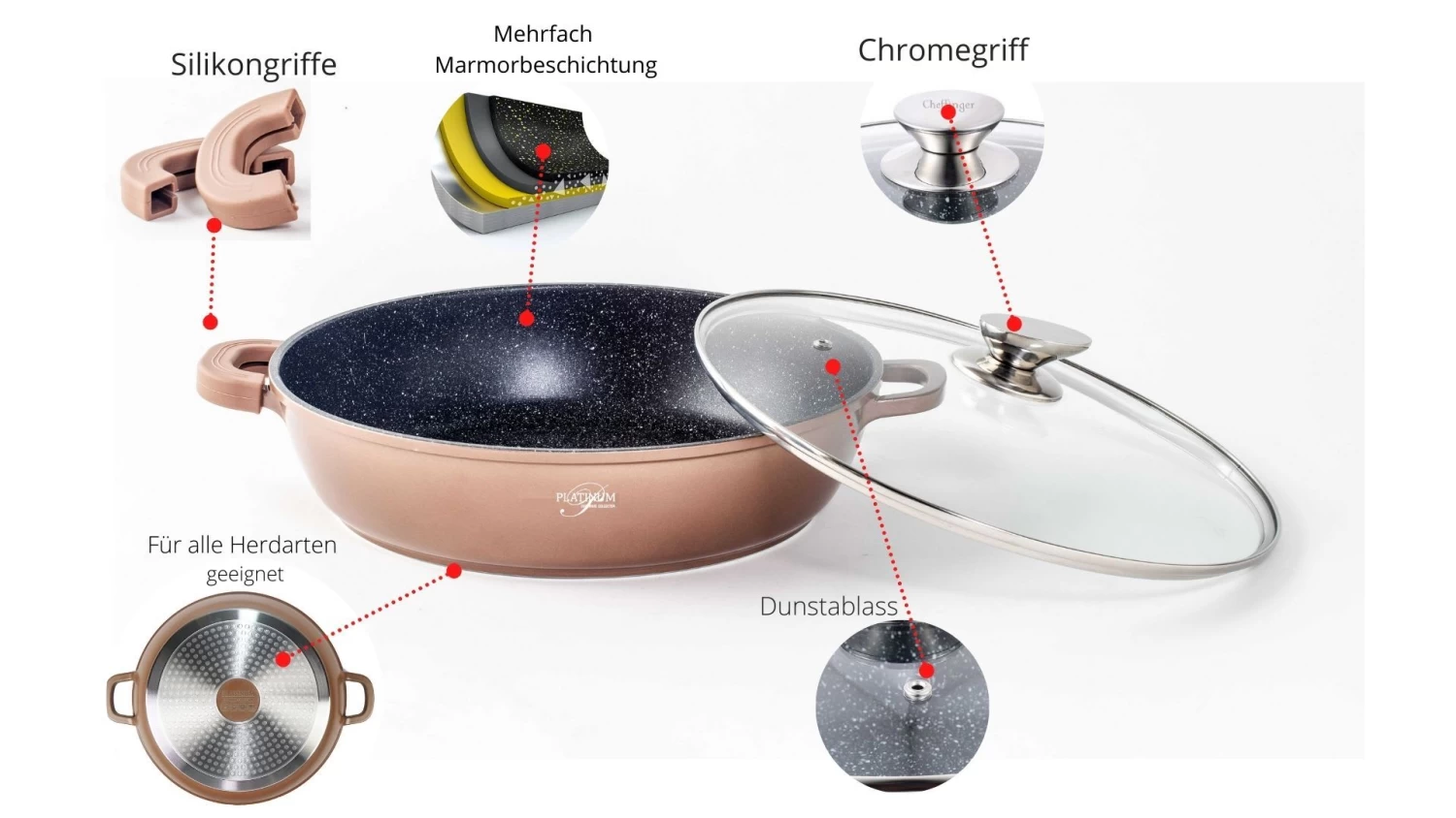 Die Pfanne besteht aus Aluminiumguss und hat eine 3-schichtige Marmorbeschichtung und abnehmbare Silikongriffe. Er kann für alle Arten von Wärmequellen verwendet werden und kann auch im Ofen bis 220 Grad eingesetzt werden. Der mitgelieferte Deckel besteht aus gehärtetem Glas und hat einen Edelstahlknopf