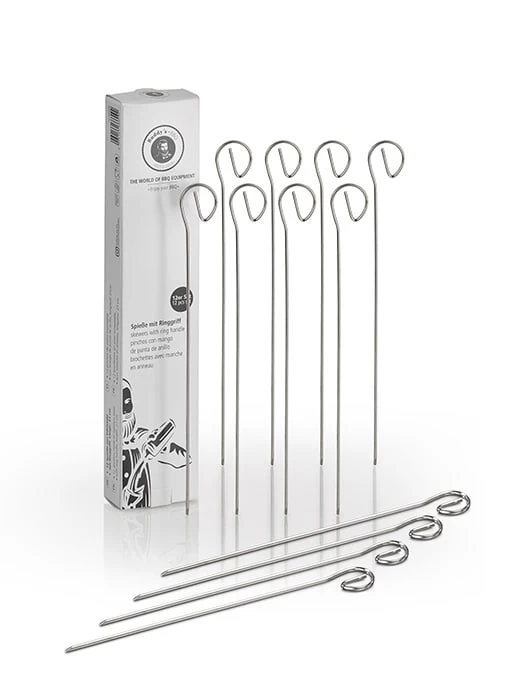 Die Premium-Edelstahl-Spieße mit praktischem Ringgriff sind leicht zu halten und vermeiden Verbrennungen. Sie können nach kurzem Abkühlen angefasst werden und das Grillgut kann direkt vom Spieß gegessen werden.