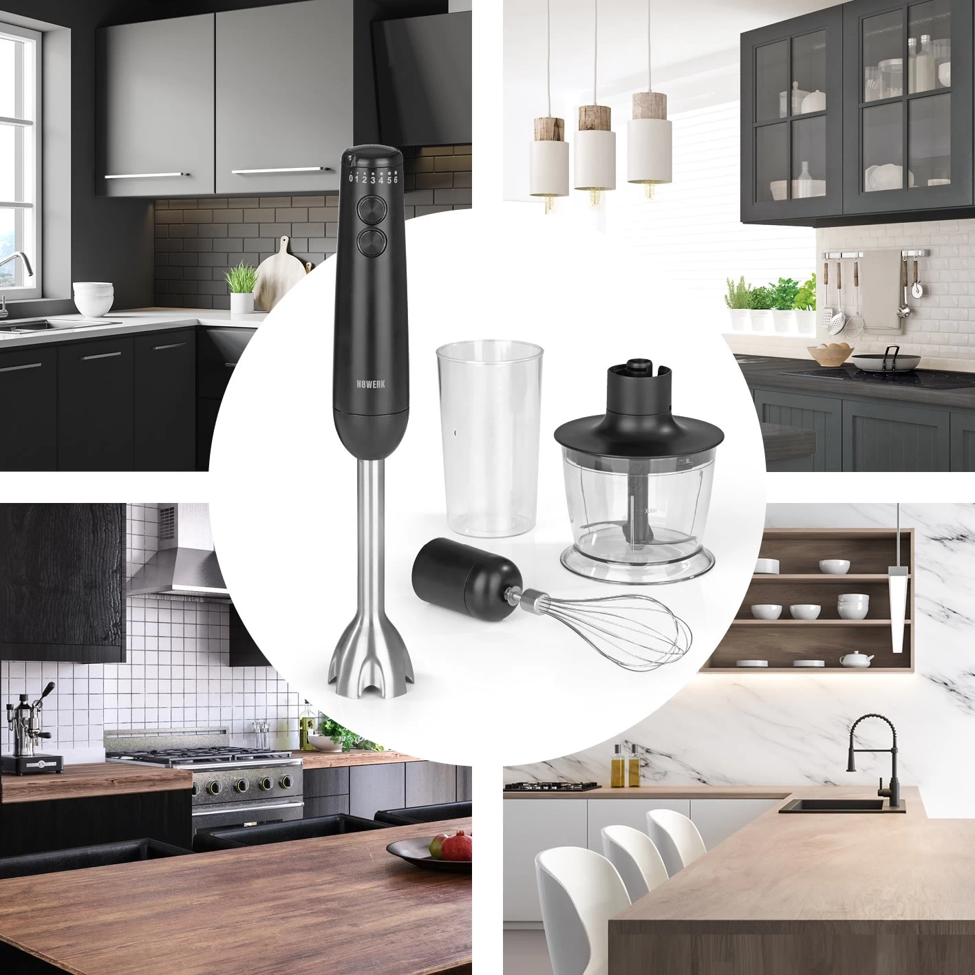 – Lieferumfang: 1 x Motoreinheit, 1 x Stabmixer-Aufsatz, 1 x Schneebesen-Aufsatz,1 x Multizerkleinerer-Aufsatz mit Behälter, 1x Edelstahl-Schneidklinge, 1 x Messbecher (700 ml), 1 x Verbindungsstück