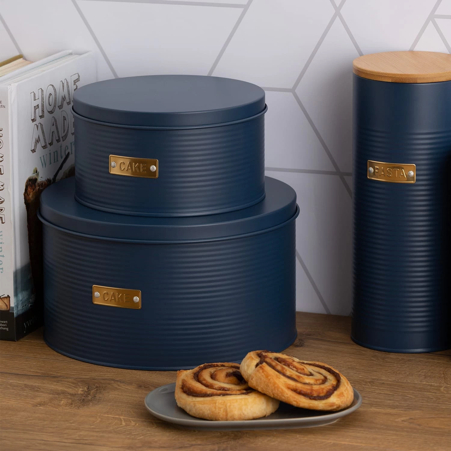 Die großen Kuchenbehälter bieten umfangreichen Platz für die Aufbewahrung und den Transport von runden Kuchen und Torten. Das hochwertige Design und die stilvolle Farbkombination aus dunkelblau und Goldemblem zeugen von Qualität und Stil. Fassungsvermögen: 2,5 Liter und 6,7 Liter.
