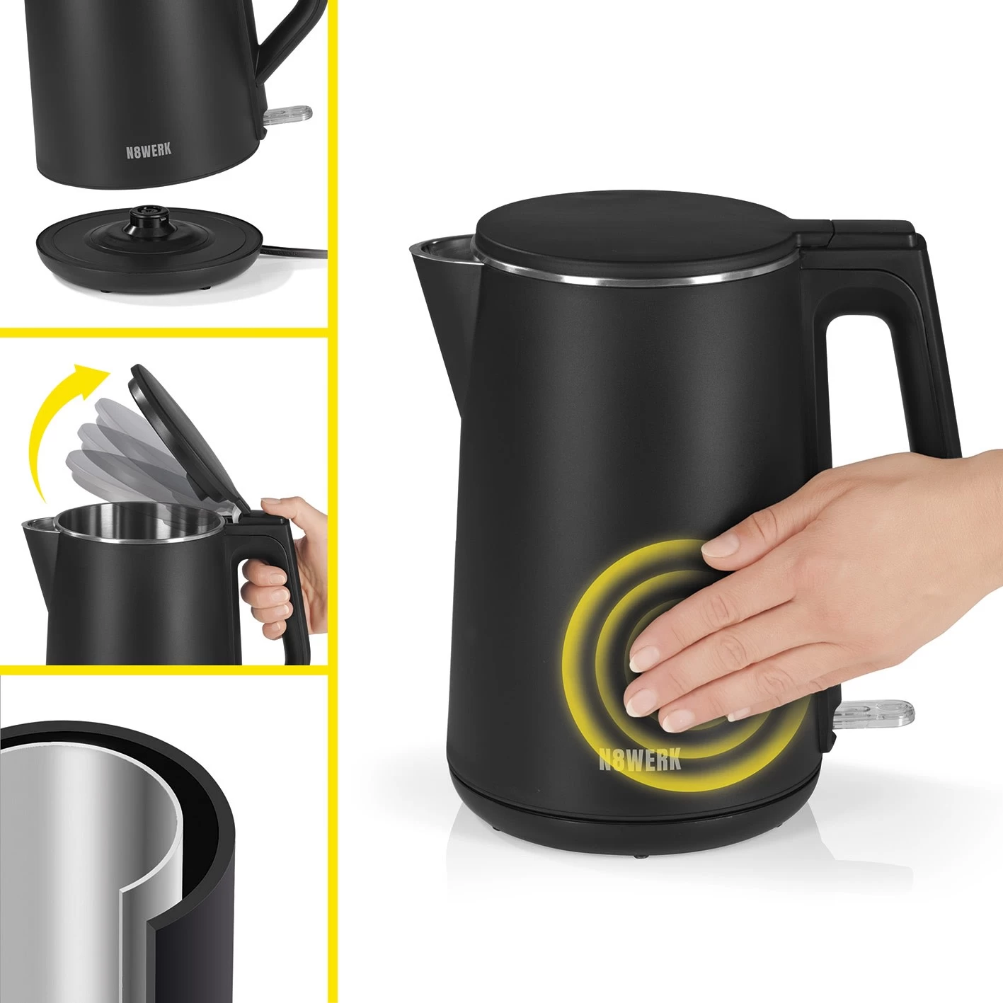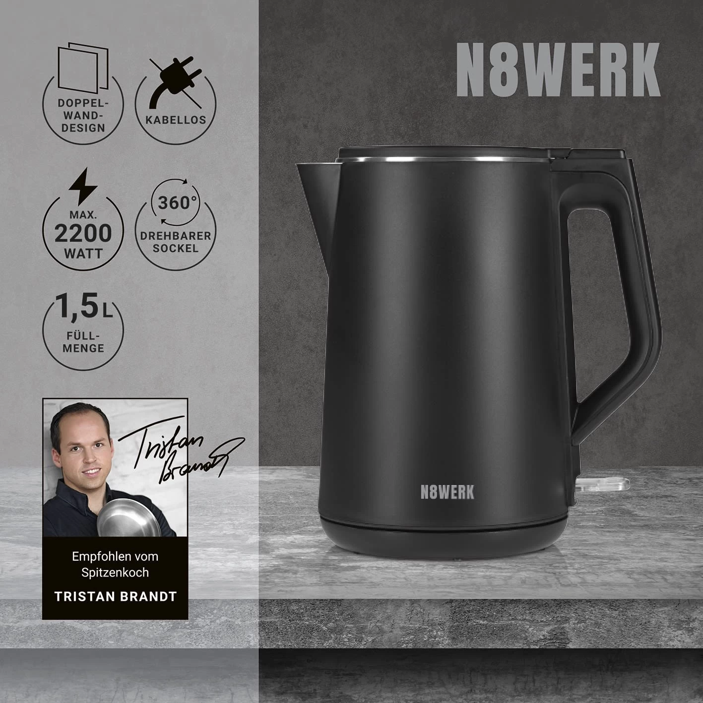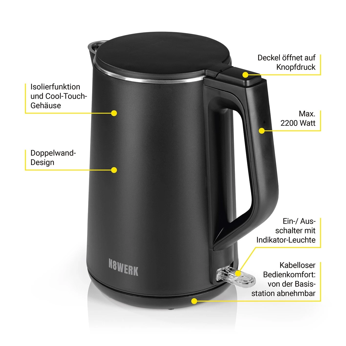 Das Doppelwand-Design (außen Kunststoff in edler Matt-Optik, innen Edelstahl) ermöglicht dir eine sichere Handhabung, da das Außengehäuse sich nicht erhitzt. Weitere Funktionen für deinen Bedienkomfort: Trockengehschutz, Überhitzungsschutz, verdecktes Heizelement für einfache Reinigung, Ein/Aus-Schalter mit LED Licht, Basisstation mit Kabelaufbewahrung. Einfach. Stylish. Der N8WERK Wasserkocher in der Midnight Edition.