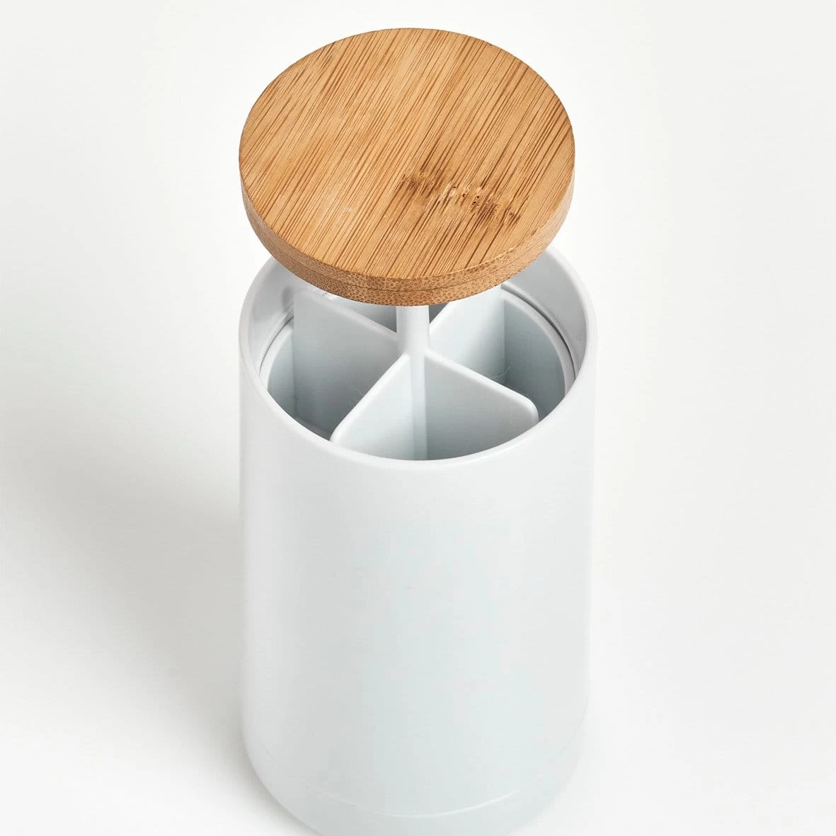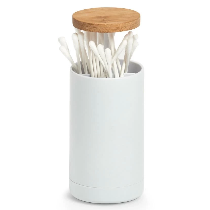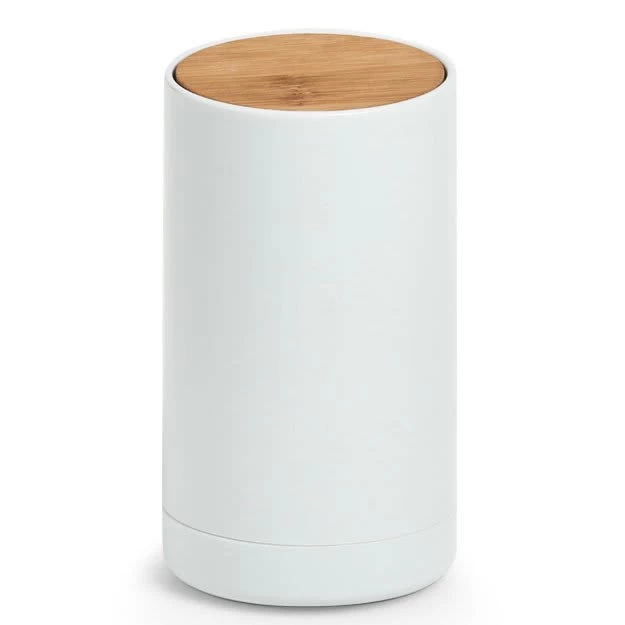 Das Zubehör, das Ihnen hilft, Ordnung im Badezimmerregal zu bekommen, ist ein ZELLER Ohrtupferbehälter. Das Produkt ist 6,5 cm x 11,5 cm (Durchmesser x Höhe) und besteht aus robustem, weißem Kunststoff. Dank seiner Abmessungen wird es einen großen Vorrat an Kosmetikstäbchen aufnehmen und gleichzeitig nicht viel wertvollen Platz einnehmen. Der flache und glatte Boden sorgt dafür, dass die Ohrtupfer nicht rutschen und verrutschen oder die Oberfläche zerkratzen können .